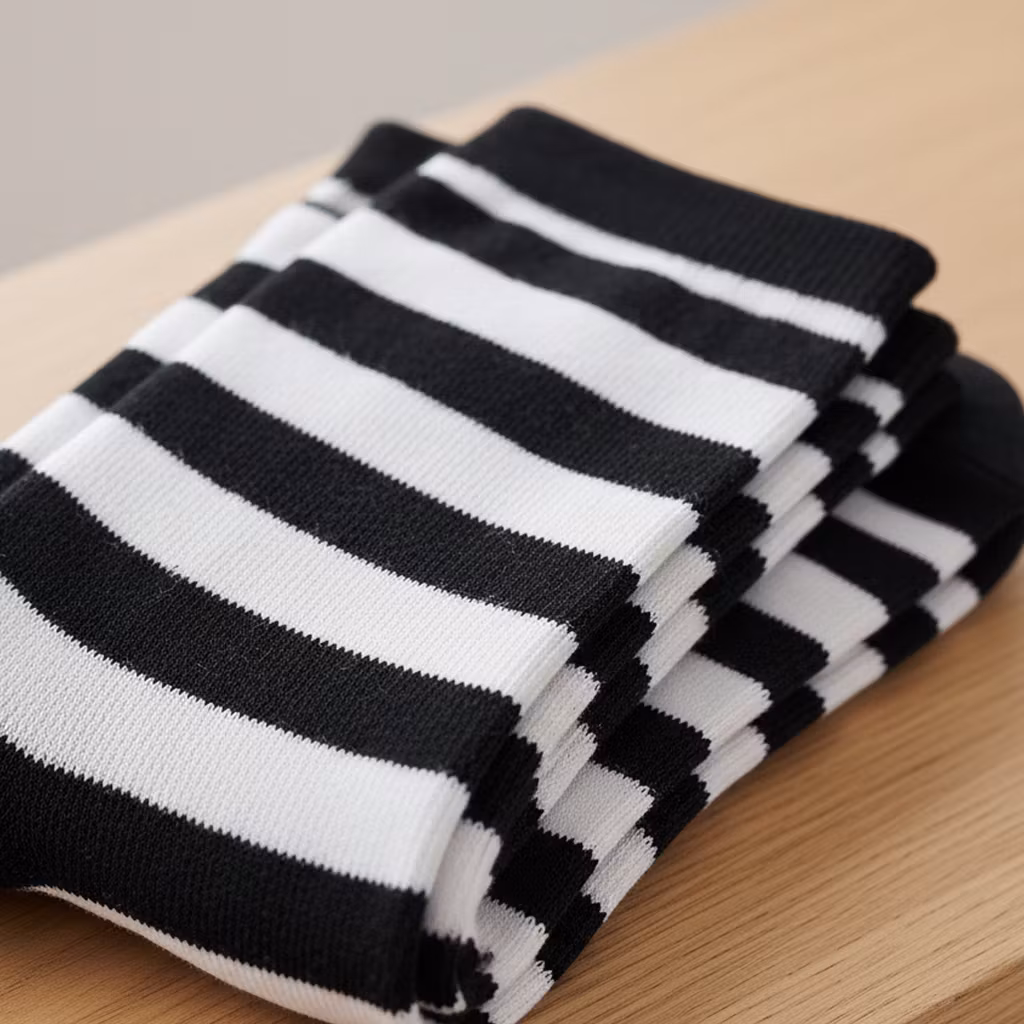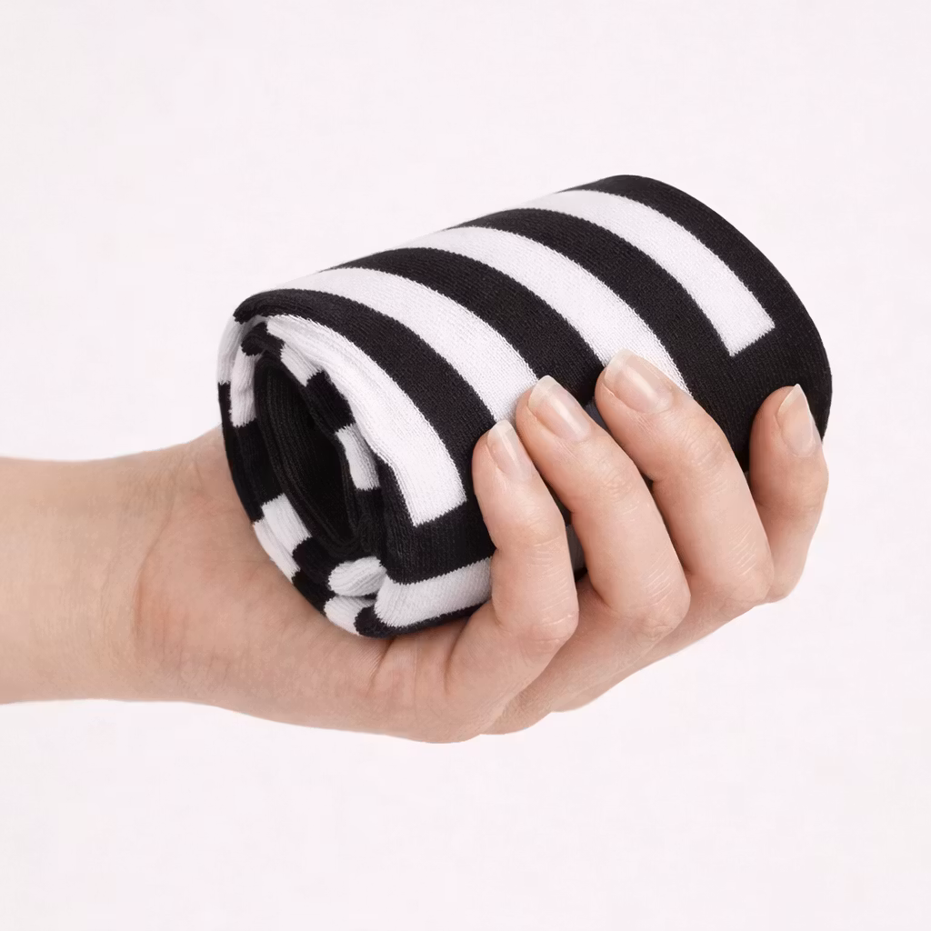 Een paar zwart-wit gestreepte steunkousen die u helpen de bloedcirculatie in de benen en voeten te verbeteren. De steunkousen voorkomen spataderen, verminderen de kans op blessures bij het sporten en helpen de bloedsomloop op peil te houden bij bijv. vliegreizen.