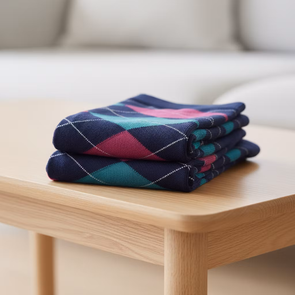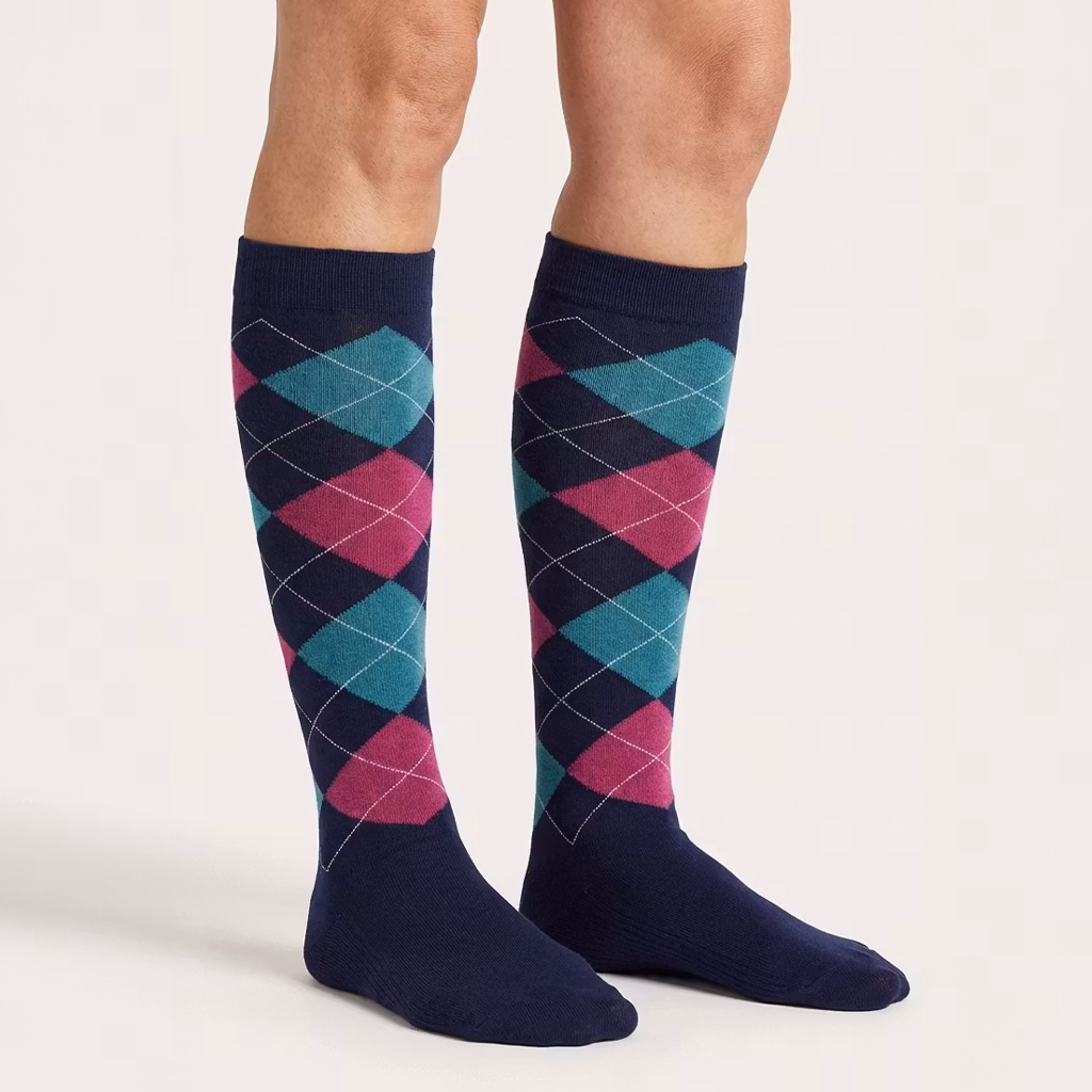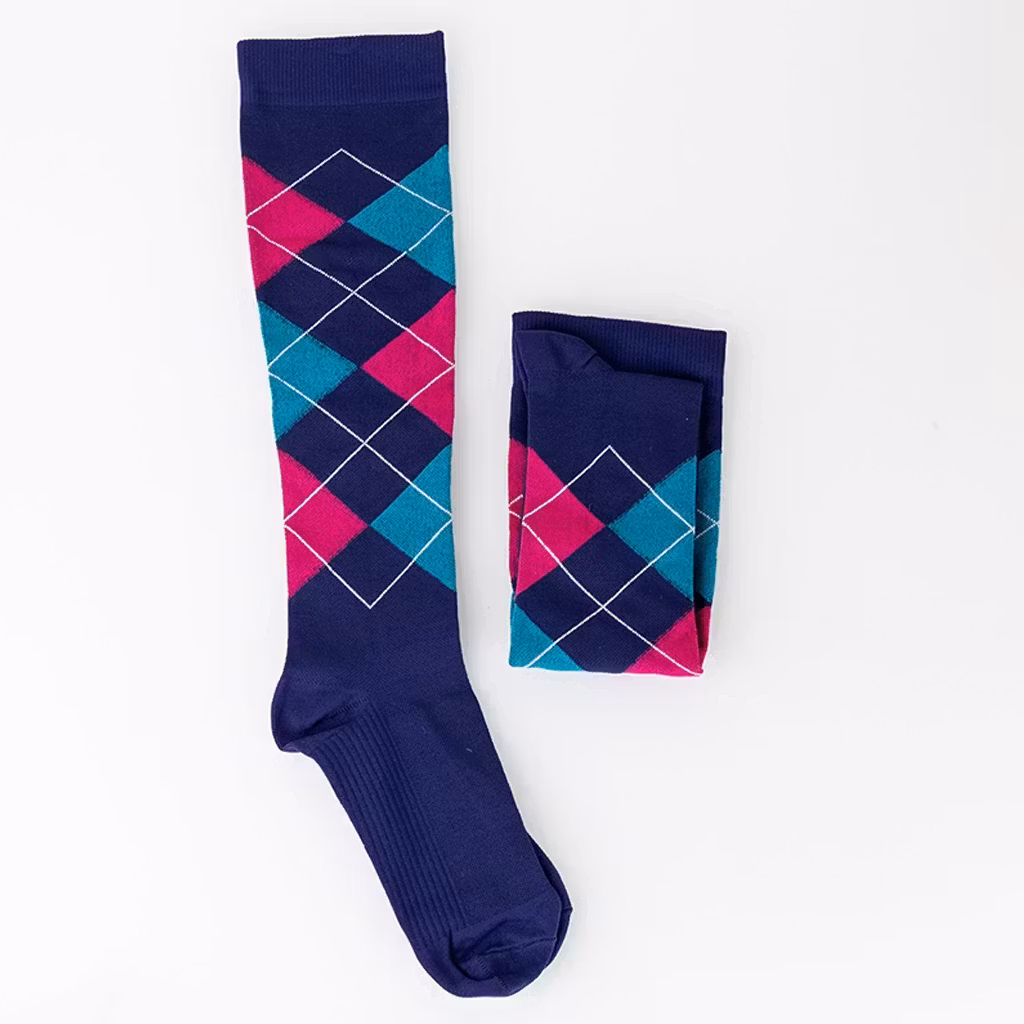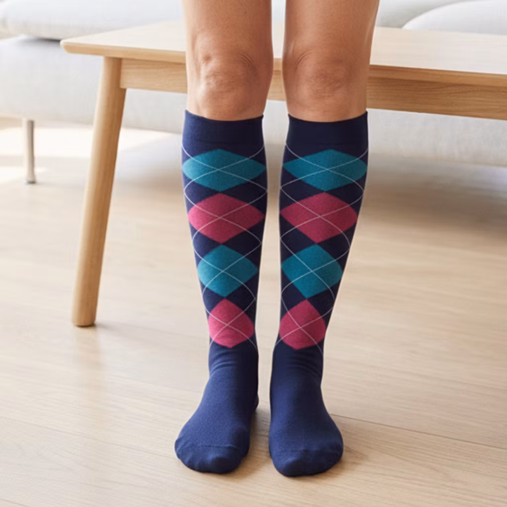 Een paar compressiekousen met een geruit patroon. De steunkousen bieden compressie aan uw benen, waardoor de bloedcirculatie in de benen wordt verbeterd. De steunkousen gaan zwellingen en vermoeidheid in de benen tegen. De steunkousen zijn ideaal voor wie de benen veel belast gedurende de dag,