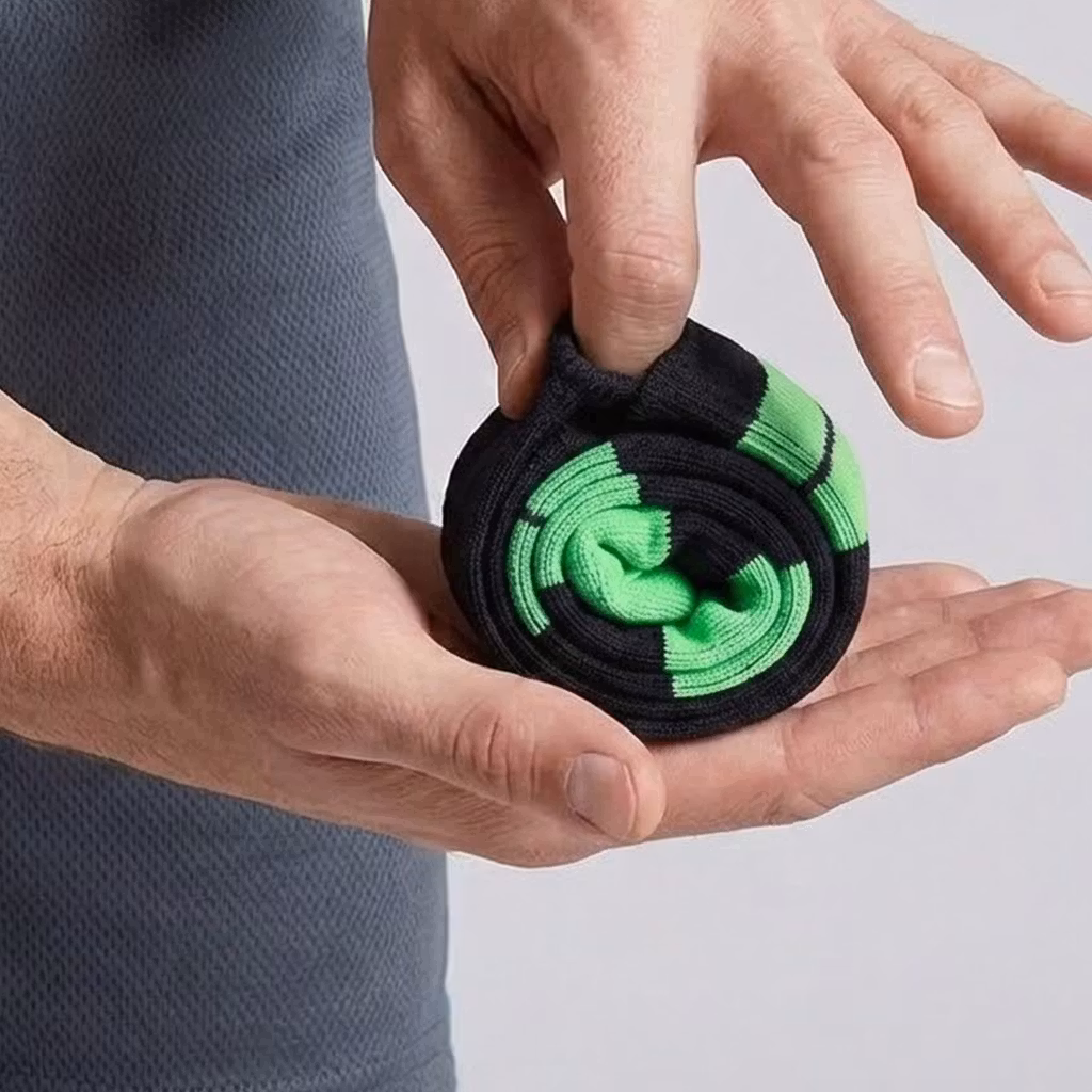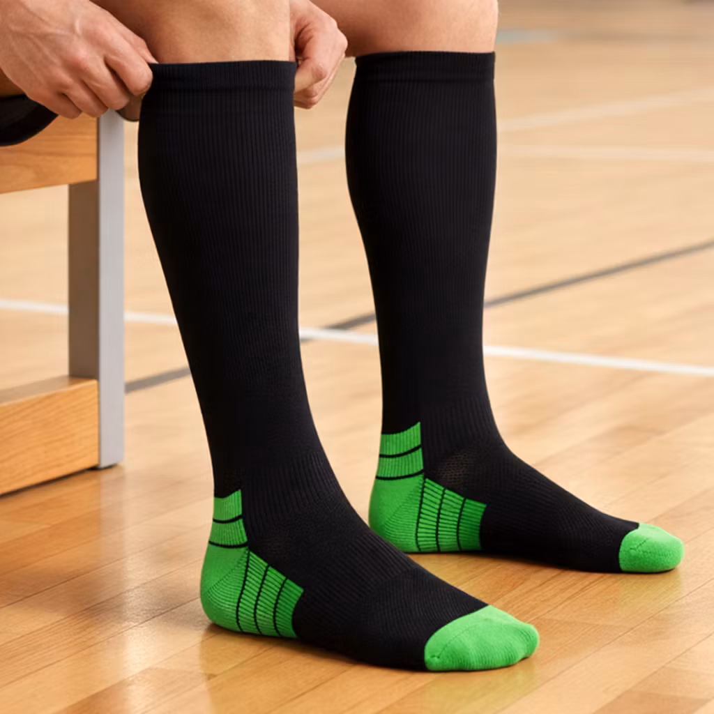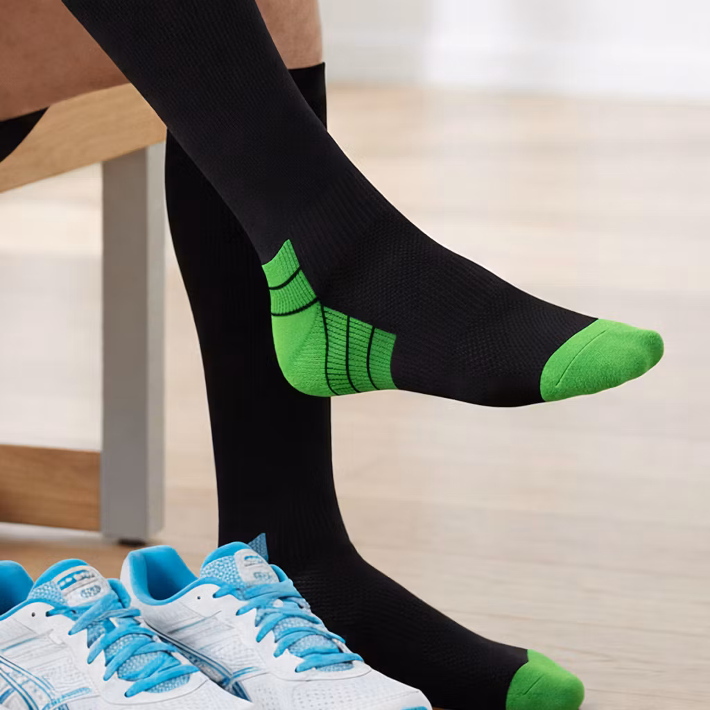 Een paar groene steunkousen die de bloedcirculatie in uw voeten en benen verhogen. De compressiekousen kunnen onder andere spataderen voorkomen, de kans op blessures verminderen tijdens het sporten en helpen de doorbloeding in de benen op peil te houden.