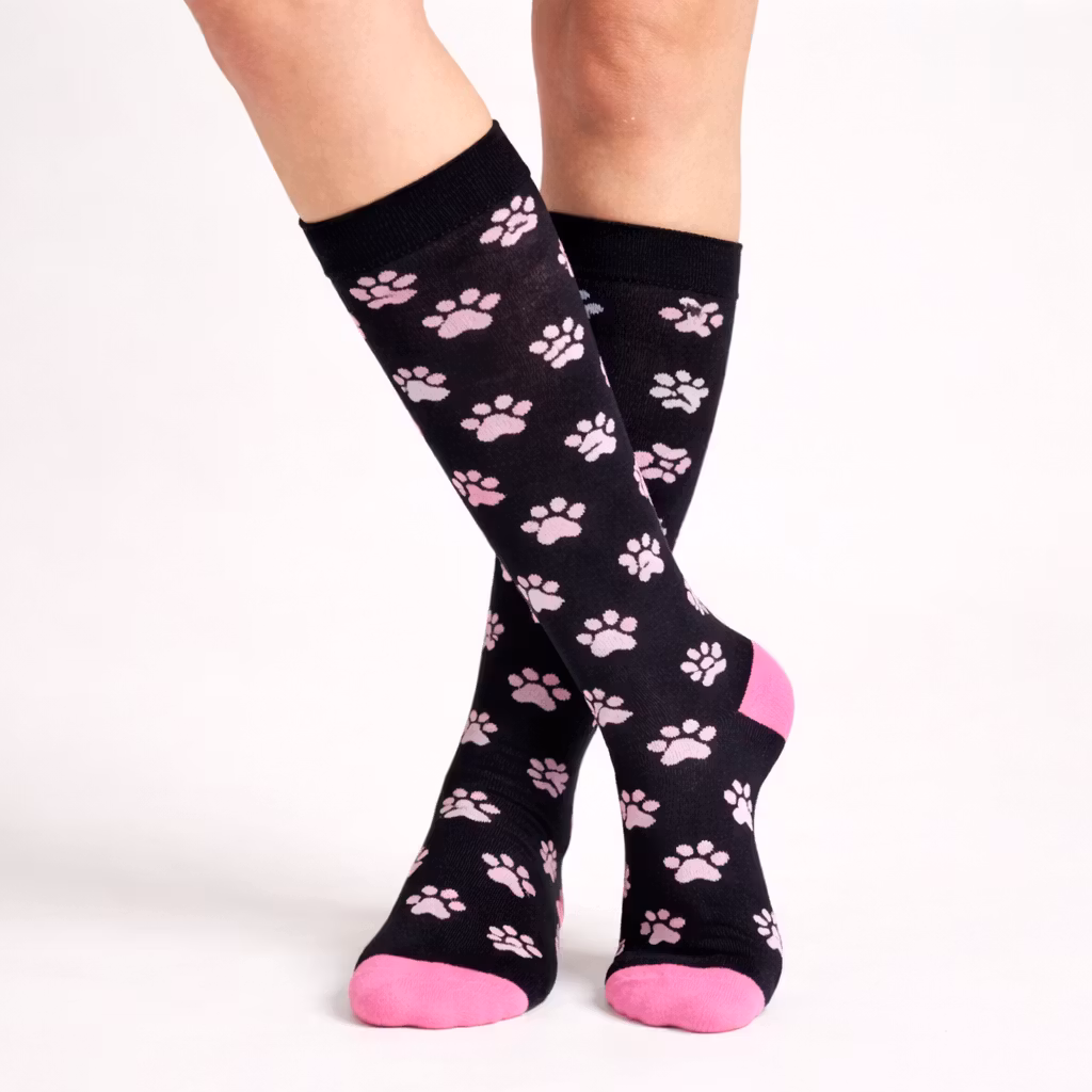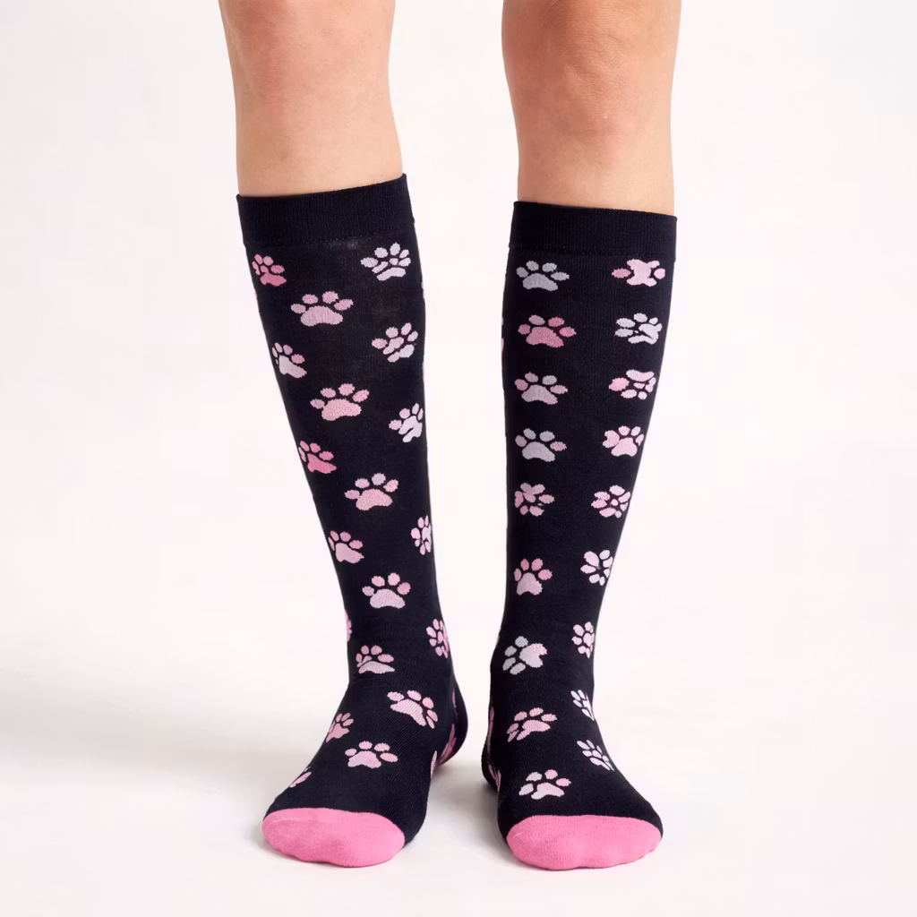 Een paar mooie steunkousen met een patroon van schattige pootjes. De steunkousen bieden compressie aan de benen, wat tegelijkertijd de benen ondersteunt. De steunkousen verminderen zwelling en vermoeidheid in uw benen. De steunkousen werken als een uitstekend hulpmiddel voor wie de benen gedurende de dag belast.